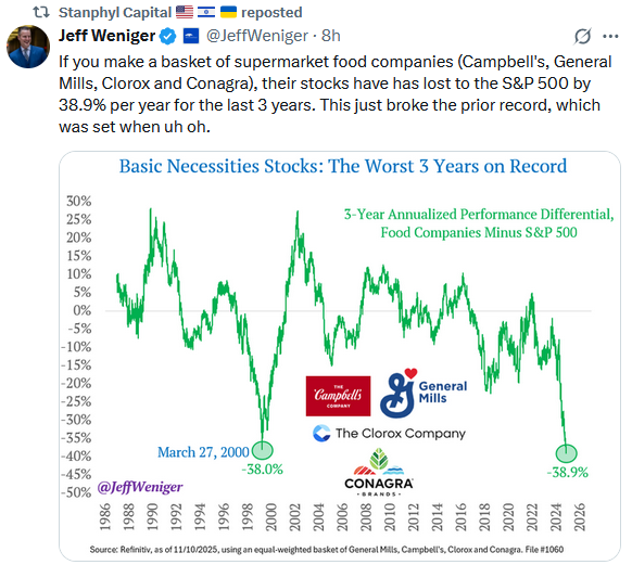 While the broader market indexes are having a great year, led by the largest-cap stocks, technology, and AI-related companies, other sectors, such as consumer staples, are languishing. At some point, the market will rotate toward consumer staples and other out-of-favor stocks. To help foresee which sectors and stocks may outperform in the future, we share the page below from SimpleVisor. The two graphics at the top of the page show the relative performance of staples versus the S&P (left) and versus the other sectors (right). The relative performance versus the S&P 500 is almost mirror-like. Often, the S&P 500 and staples move in the same direction, though one may outperform the other. The current divergence is rare. The bar chart shows the underperformance of staples relative to the other sectors.