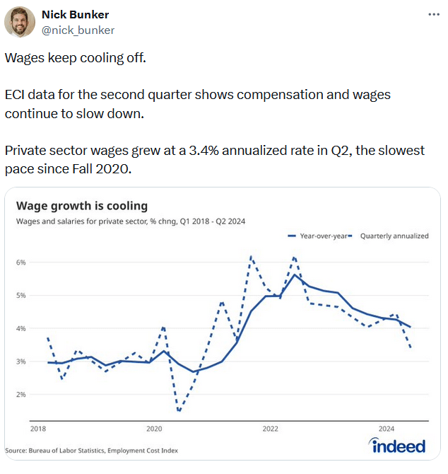 The ADP private sector jobs report showed a below-consensus gain of 122K compared to 155K last month. This is the lowest job growth since January’s 111K, bringing the 2024 monthly average to 160K. ADP’s Chief Economist Nela Richardson made a very important statement regarding the report: “If inflation goes back up, it won’t be because of labor.” If correct, a critical driver of inflation is no longer a problem.