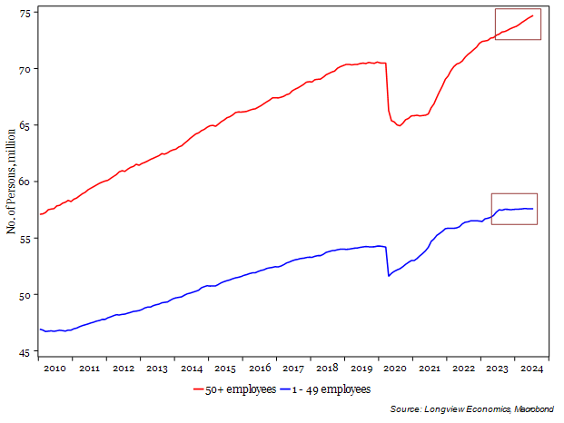 Between ADP and JOLTs, the labor market clearly shows signs that the labor market has normalized completely. The current estimate for Friday’s BLS payroll growth is +185K. Note that the BLS survey only includes large companies. However, as shown below, companies with less than 50 employees have seen no job growth for about a year. This is a good example of the weakness beneath the headlines.