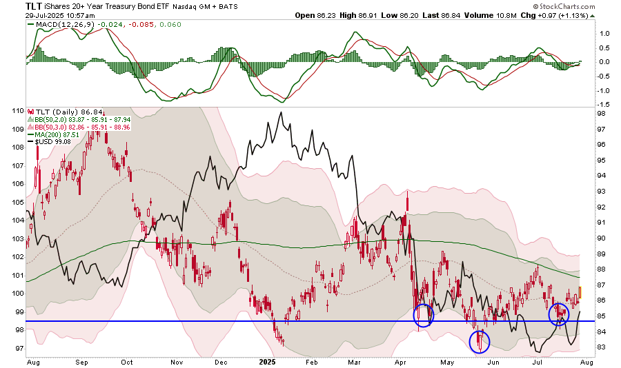 Given that bonds are both a “risk-off” asset and a store for reserve currencies, we also see support for bond prices building in the US Dollar, which is also forming a base. If the dollar strengthens, this should lead to inflows into US bonds, helping support higher bond prices.