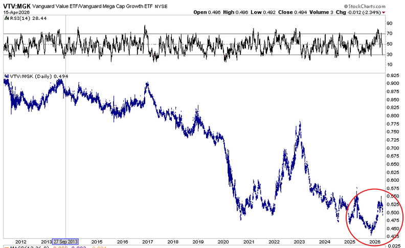 The graph shows the price ratio between the Vanguard large-cap value ETF and the Vanguard mega-cap growth ETF. The trend over the last 15 years has been lower, ie, growth has greatly outperformed value. To the bottom right, we see the nearly 20% outperformance of value over growth, which started in November. The recent outperformance of growth over value has erased about a third of the move. Will the current experience be like the temporary value outperformance during the Liberation Day events, or could it be more sustainable, as we saw in 2022? Before considering our questions, it’s worth noting that the real value sector is technology and mega-cap growth, as shown in the third graph.