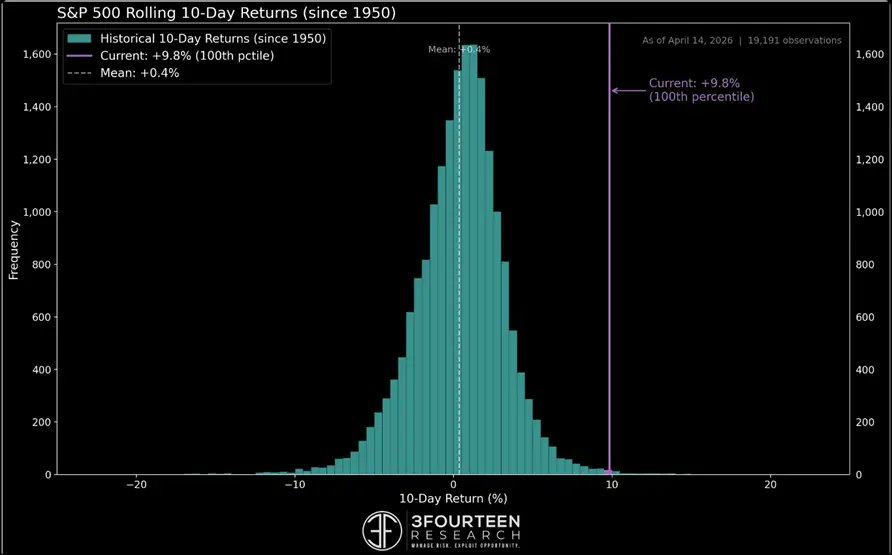 The statistics are hard to ignore. As 3Fourteen Research noted this morning, the S&P 500’s 9.8% gain over the last 10 trading days ranks in the 99.7th percentile of all 10-day rolling returns since 1950. Only 20 comparable episodes exist in 76 years of data.