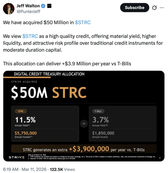 Strive Asset Management (ASST) said on Wednesday it has allocated $50 million of its corporate treasury to STRC, the preferred stock issued by Strategy. The investment represents more than one-third of Strive’s treasury reserves and reflects growing institutional interest in yield-generating securities linked to Bitcoin-focused treasury strategies, according to a company announcement.