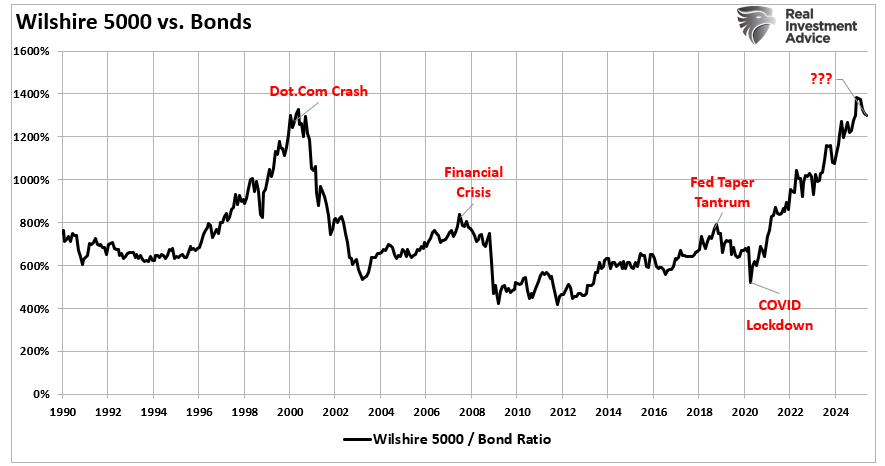 The bullish bias is evident in the long-term relationship between stocks and bonds. The ratio of stocks to bonds has far exceeded that of the “Financial Crisis,” and is now on par with the “Dot.com” bubble peak, with a similar sharp slope higher.