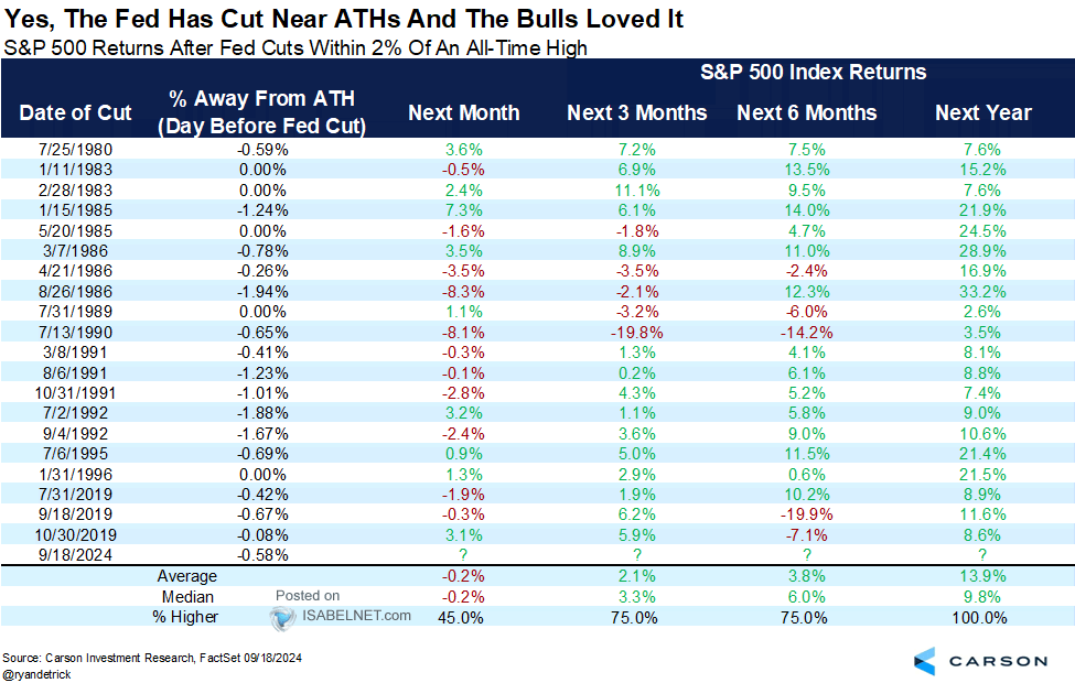The market has continued to front-run the Fed’s rate cuts during the last two years. Each rally turned to disappointment as the Fed postponed while continuing to fight inflation. However, this past week, that battle was won. The question is, what happens next? A recent table from Carson Investment Research shows that near-term performance has been a mixed bag when the Federal Reserve has previously cut rates within 2% of all-time highs. However, returns over the next year are positive 100% of the time.