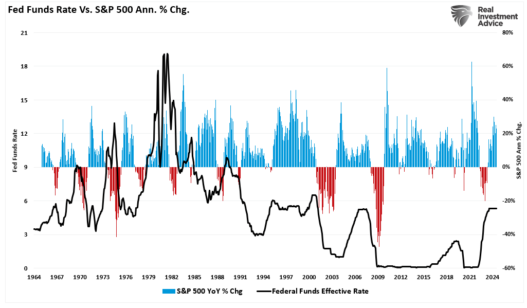 The crucial point is not whether the Federal Reserve cuts rates further but economic growth and its impact on earnings. As shown, there is a high correlation between the annual rate of change in the S&P 500 versus the annual growth in earnings.