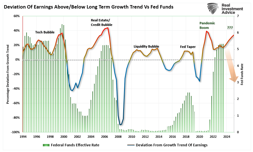 The chart below shows corporate earnings’ deviation from long-term exponential growth trends. You will note that the earnings deviation reverts when the Fed cuts rates. Therefore, while analysts are optimistic about earnings growth going into 2025, a Fed rate-cutting cycle will likely disappoint those expectations.