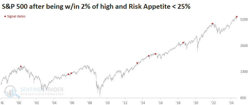 Further analysis by Sentiment Trader showed that when such an environment has previously existed, stocks rising with falling risk appetite typically occurred close to a short-term market correction at best and a market peak at worst.