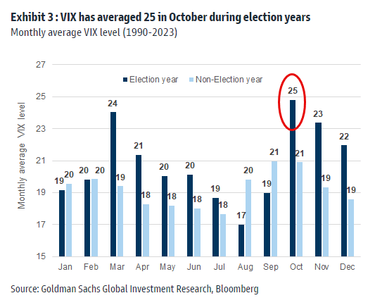 “On average, over the past 30+ years, VIX has increased 6% from September to October, and we see upside risks to the current VIX levels given seasonality and upcoming macro/micro catalysts. Based on our seasonality of volatility study across regions, we have found a consistent pattern across major indexes of increased volatility from August to October.“