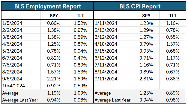 The Fed has begun cutting interest rates with the timing and amount of future cuts predicated on incoming employment and CPI data. As the Fed likes to say, they are data-dependent in determining their course of action. Given the importance of Fed policy on the markets, one would presume that on the day of the release of crucial employment and inflation data, market volatility would be higher than average in the stock and bond markets.
