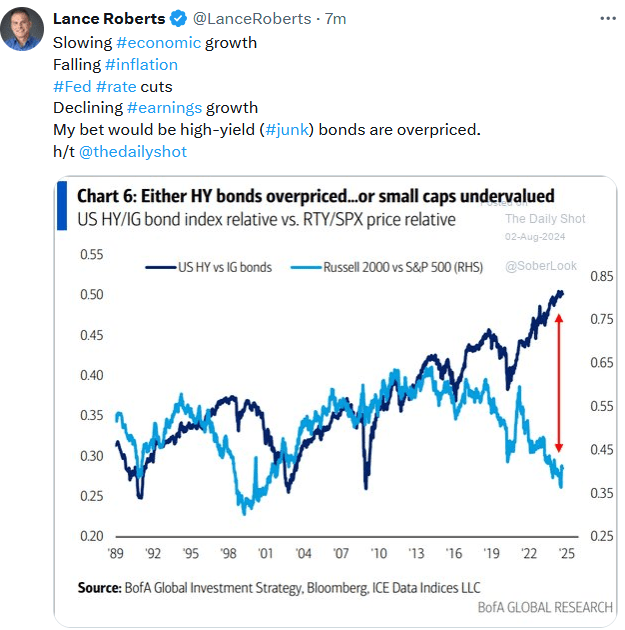 Such happened this past week, with a strong rally on Wednesday that failed. What is clear is the market is starting to recognize that Federal Reserve rate cuts are not bullish for stocks. As we have discussed, when the Fed cuts rates, it often coincides with weaker economic activity, which precedes a decline in earnings growth. The drop in the ISM manufacturing index and a terrible employment report bolstered those concerns. Unsurprisingly, the market is beginning to discount the impact on earnings by reducing stock prices.