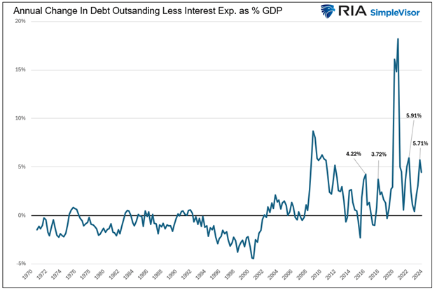 The graph below puts the deficit and interest expenses into context. It shows deficits, sans interest expenses, as a percentage of GDP. The recent peak, 5.71%, is historically high, but notice the deficit spending of the financial crisis and pandemic-related stimulus dwarf it. Further, last quarter’s peak is not far from the 2016 and 2018 highs when spending was not generally considered out of control.