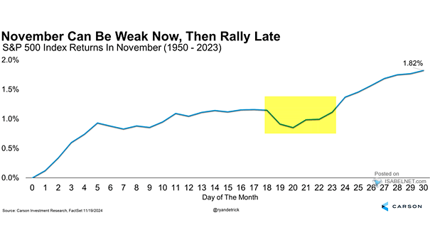 While the trade into month-end tends to be positive, we expect to see another patch of weakness in early December as mutual funds complete their annual distributions. However, post that weakness, the bullish bias remains into year-end as professionals window dress their portfolios for year-end reporting.