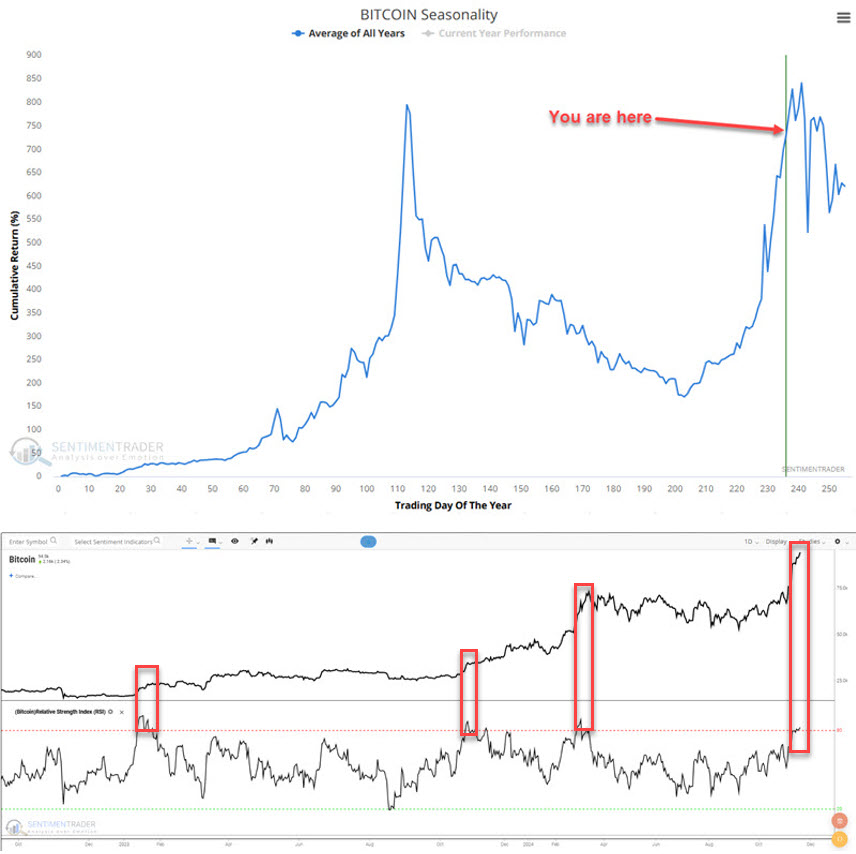 Since the election, Bitcoin has risen nearly 50%. While Bitcoin investors are licking their chops, believing the magnificent rally will continue, they need to realize that Bitcoin is entering a period of pronounced seasonal volatility. The graph below from Sentimentrader shows that the recent performance has tracked the typical performance for the time of year. However, as they highlight with the green line, the recent gains may fade, and volatility in Bitcoin may pick up. The lower graph highlights that Bitcoin’s RSI is very extended. The prior three times it was as overbought resulted in a pause to the sharp rate of assent in Bitcoin. Sentimentrader sums it up nicely in their quote below:
