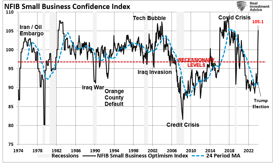 Bullish exuberance is returning to the markets and the economy in a big way following the Presidential election. Such is particularly the case with recent executive orders signed by Trump, which fulfill Trump’s promises to “Make America Great Again.” Given that short-term market dynamics are driven primarily by sentiment, as investors, we can not dismiss the rapid turn in optimism over the last few weeks. We addressed this point in this past weekend’s “Bull Bear Report,” which I want to build on in today’s commentary.