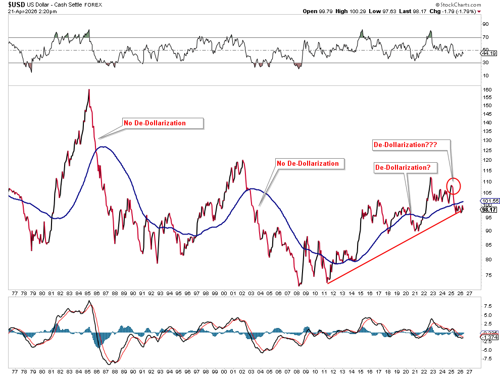 Social media has been awash with dramatic proclamations that “the dollar is dying” and “nobody wants the USD.” The narrative has become so pervasive that it risks hardening into a consensus. However, a quick glance at the chart tells a more nuanced story. While the Dollar Index (DXY) has drifted lower over the past two years, it remains near 98 today, essentially flat over the trailing 12 months and still well above its long-term historical averages. That is hardly the collapse being advertised.