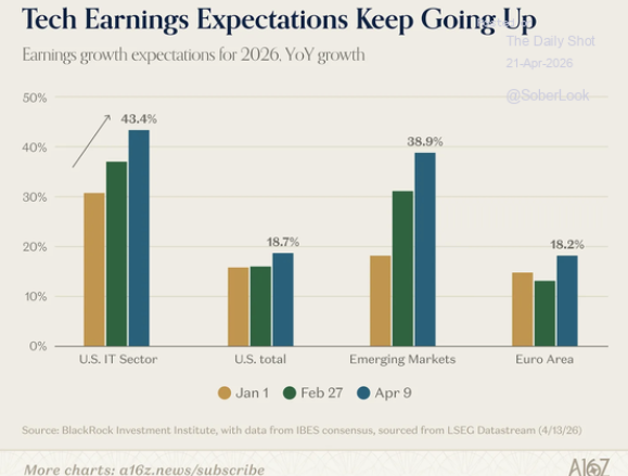 The why behind those flows becomes obvious when we examine earnings. Consensus expectations for the U.S. IT sector have ratcheted higher throughout 2026, with earnings growth now projected at 43.4%, up from 30.9% at the start of the year. Emerging markets follow at 38.9%, while the U.S. total is pegged at 18.7%. More telling still, Info Tech earnings are expected to grow more than 2x faster than the S&P 500 as a whole (40% vs. 18%), with only Energy and Materials meaningfully outpacing the index.