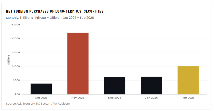 More importantly, the flow of foreign capital into U.S. assets has not merely held steady; it has accelerated. According to the latest Treasury International Capital (TIC) data, foreign residents purchased a net $101 billion of long-term U.S. securities in February alone, following November’s blockbuster $222 billion print. Over the last five reporting months, foreigners have added roughly $488 billion to U.S. long-term stocks and bonds, a pace that rivals the post-COVID liquidity surge and flatly contradicts the “capital flight” story.