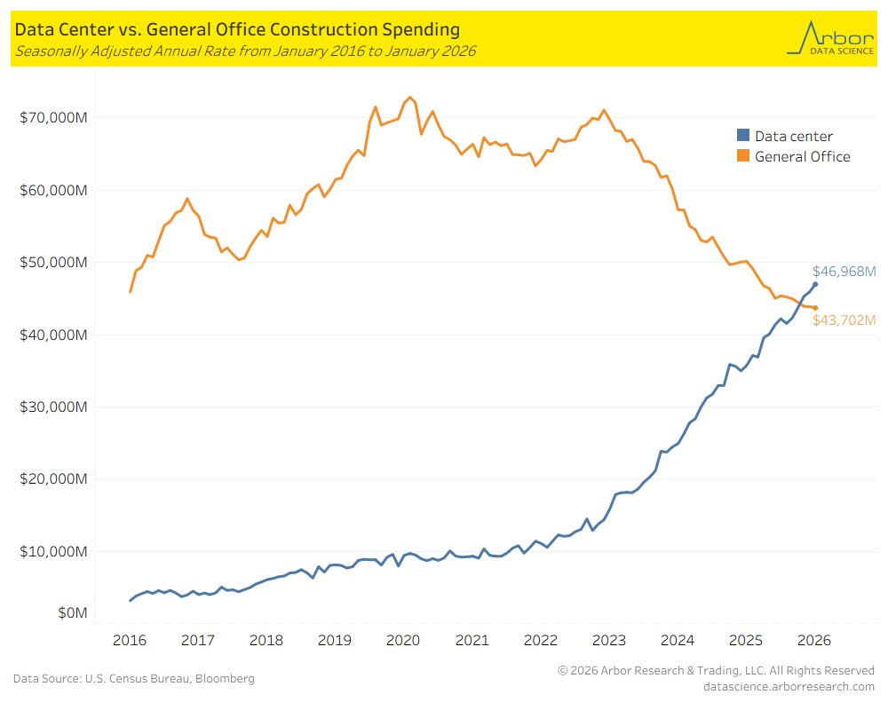We believe this anomaly is largely due to construction spending in data centers. The second graph shows that data center construction spending has grown from $3 billion in 2016 to $47 billion today. Moreover, spending on data centers has overtaken that spent on offices.