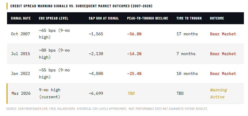 It isn’t the absolute level of the CDX that matters, but the direction of travel and the rate of change. If investors wait for the “spike,” it will likely be too late to act. Sentiment Trader’s nine-month high threshold isn’t about measuring the peak of a crisis; it is a warning of a potential turn. Credit stress doesn’t arrive fully formed. It builds. Each of the prior signals triggered before the real damage was done, precisely because spreads were starting to move, not because they had already maxed out.
