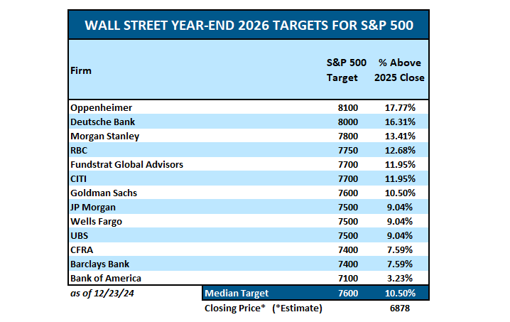 Yesterday, we touched on the outlook for 2026 and to be on alert for a rotation from this year’s winners. As we move into year-end, and as discussed in Monday’s blog post, expectations are very bullish for 2026. The table below displays the latest estimates for 2026 full-year price targets, along with the percentage change from yesterday’s close. With a median target of 7600 and a 10.50% return, analysts remain optimistic.