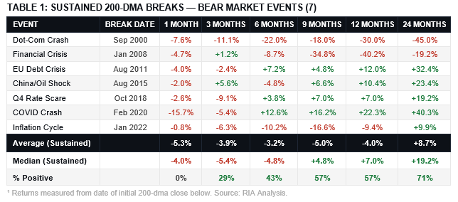 The performance numbers across those seven events are unambiguous. The average one-month return after the break: -5.3%. The average 12-month return: -4.0%. Not a single one of those seven events posted a positive first-month return. Zero for seven. Investors who bought the initial 200-dma break in 2000 and 2008 were still underwater two full years later.