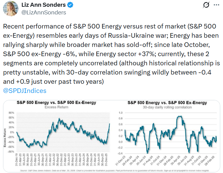 Here is the point. The market bounce yesterday morning was not surprising after the sell off we have witnessed as of late. We have suggested that rallies could be sharp and should be used to rebalance risk. We still think that is the case, particularly since Tehran immediately denied that any talks occurred. If yesterday’s rally was built on a five-day ceasefire promise from one side of a conflict, disputed by the other, the risk premium could be priced back in quickly. We’ve seen this script before. The market bounced on March 4 when oil pulled back briefly, then reversed when the conflict dynamics reasserted themselves. One session doesn’t retire a trend.