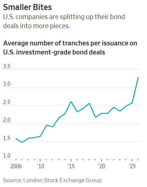 According to a recent analysis by the Wall Street Journal, corporate treasurers are fundamentally shifting how they approach the capital markets to navigate record-breaking supply. Rather than offering debt in monolithic blocks, firms are increasingly utilizing multiple corporate debt tranches to better manage investor demand. This strategic shift has pushed the average number of pieces per deal to an all-time high of 3.3.