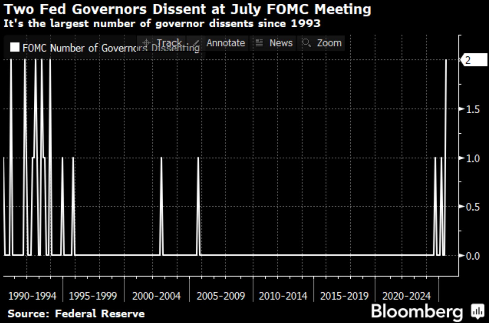 December 2024 marked the second-to-last time there was a dissent by an FOMC voting member. The dissent, at the time, was a sole vote by Jefferey Schmid against cutting rates. The last dissent was yesterday. While the Fed voted to maintain the Fed Funds rate at 4.25-4.50%, Michelle Bowman and Christopher Wallace cast dissenting votes in favor of reducing rates. Such was the first time two members dissented since 1993, as shown below. The two dissenting votes at yesterday’s meeting inform us that the tide is turning, and the rationales for not curing rates are fading.