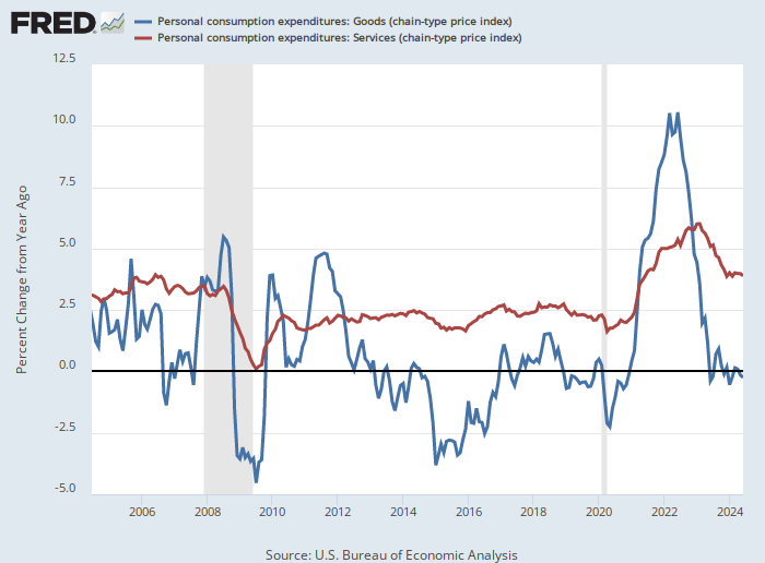 The monthly June PCE price index aligned with expectations, rising 0.08% m/m. Importantly, it affirms the string of slowing price data we have seen over the past few months. Services inflation continues to report higher inflation than goods. This past month, it contributed 0.14% to monthly PCE. Accordingly, goods prices fell slightly. The chart below shows the history of inflation in goods and services.