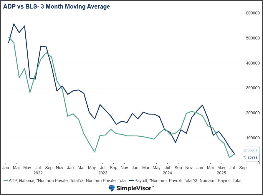 The BLS employment report was weaker than expected at +73k. However, more importantly, June’s data was revised sharply lower from 147k to 14k and May’s from 144k to 19k. Judging by the recent months, the pattern is clear: the U.S. labor market is slowing considerably, and there is enough data to conclude this isn’t a statistical or seasonal fluke. The graph below shows that with the revisions, the BLS has caught down to the ADP data, as we suspected would happen.
