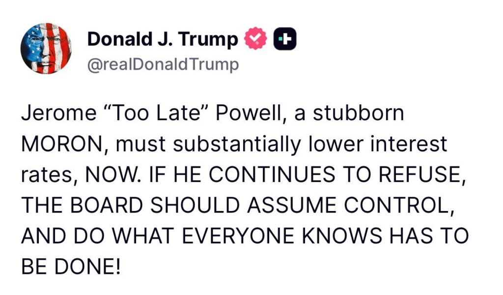 President Trump has been incessantly pressuring Jerome Powell to cut rates ever since he took office. To wit, check out Trump’s latest post on Truth Social below. The Fed cut rates in late 2024 but stopped when Trump took office. Some claim the pause is political. Conversely, the Fed primarily supports its case with fears that tariffs could generate inflation. Given their grave error in stoking inflation in 2020 and 2021, they don’t want to make the same mistake again.