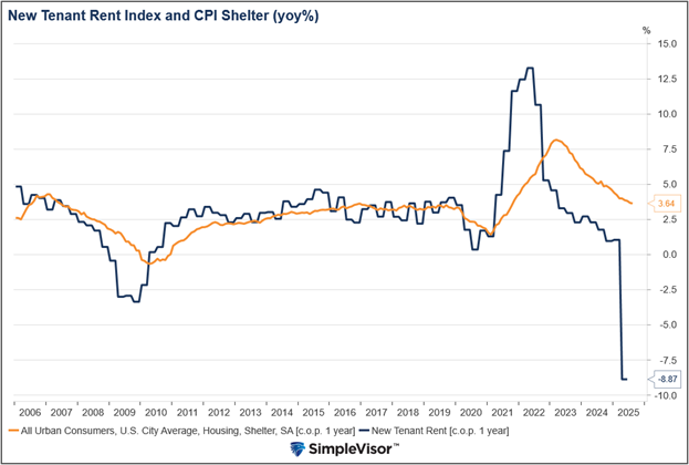 The second graph offers another factor that may keep home prices under pressure. The Cleveland Fed New Tenant Rent Index has fallen sharply over the last few months. If rents are cheaper, new potential home buyers will find that the financial incentive to buy a home is lessened. Thus, they may be more willing to wait for lower prices or make lower bids.