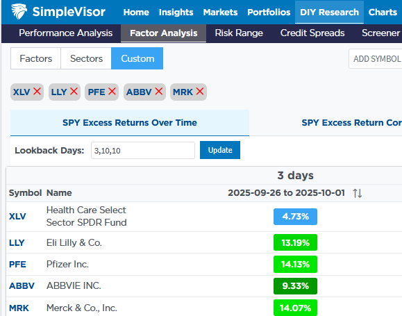 The table below, courtesy of SimpleVisor, shows that over the last three days, Eli Lilly (LLY), Pfizer (PFE), AbbVie (ABBV), and Merck (MRK) have increased by between 9% and 14%. The healthcare sector ETF (XLV) is up less, as it includes companies that do not necessarily benefit from the negotiations between the President and the drugmakers. The anchor holding down these stocks for the last year finally appears to be alleviating.
