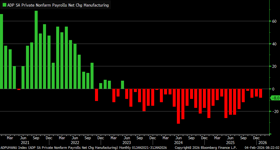 With JOLTS and Friday’s BLS employment report delayed, yesterday’s ADP release is the primary source of employment data for the time being. ADP reported that the economy generated 22k jobs in January, about half of Wall Street’s estimates. Interestingly, while the ISM Manufacturing survey was very strong, including a decent boost to its employment gauge, the ADP manufacturing employment index continues to show job losses. Yesterday’s reading was the 32nd straight month of declines.