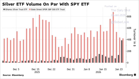 The shift in market tone is hard to ignore. Bullish sentiment has overwhelmed any bearish concern. Retail investors are back in force, chasing the hottest assets. Just like in 2021, when retail investors were chasing GameStop and AMC, they are now chasing silver. As shown, Silver’s parabolic rally has driven the trading volume of iShares Silver ETF to nearly match that of the SPDR S&P 500 ETF.