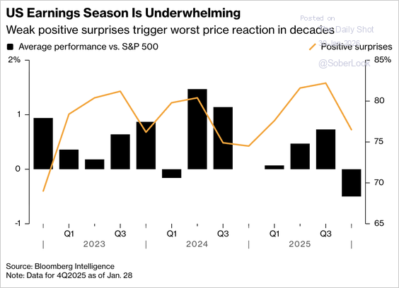 Alphabet and Amazon are set to report next week, but early signs point to a bifurcation in tech performance. Strong fundamentals are not being rewarded uniformly, and valuations are beginning to face resistance. The market remains highly concentrated in a small number of large-cap tech names, leading to outsized earnings reactions. That leaves index-level performance vulnerable to disappointing results, even if the broader economy is stable.
