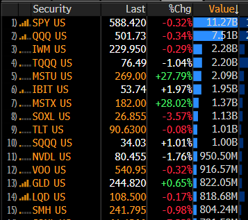 As he notes, the problem with taking on leverage is that while leverage works to your benefit on the way up, it will crush investors on the way down. A good example is the levered 2x Long ETF (MSTU) for Microstrategy (MSTR), the 5th most traded ETF on November 20th.