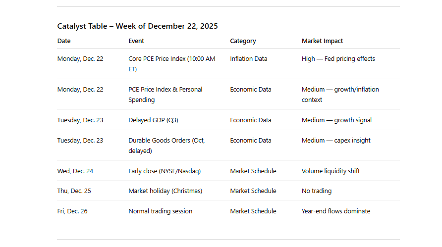As the market enters the final week of regular trading before year-end, the calendar shifts from heavier macro releases to a mix of critical economic data, light earnings, and holiday-impacted sessions. With major U.S. stock exchanges remaining open through December 26 (including trading on December 24 with an early close and a full session on December 26), positioning will increasingly reflect seasonal flows as well as reactions to late-cycle indicators that can impact rate expectations and risk appetite. Markets continue to digest recent economic developments amid ongoing uncertainty about rates and inflation, meaning that even a limited slate of catalysts can trigger outsized reactions.