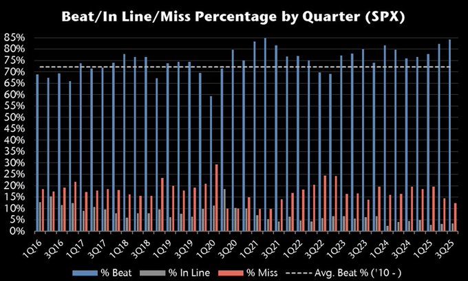 Of course, we have many more announcements to go, but so far, and as we noted before, we came into earnings season with largely reduced expectations, leading to a high “beat rate.” To wit: