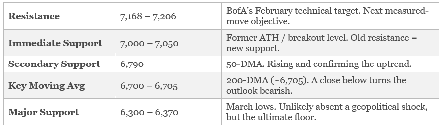 The technical picture remains unambiguously bullish across all time frames. Investing.com shows 12 of 12 moving average signals at “Strong Buy.” The 14-day RSI is near 70, indicating an overbought condition. The MACD, a measure of momentum, is on a “buy signal” and rising. The index is trading above the 50-DMA (~6,790) and above the 200-DMA (~6,705), both of which are rising. Breadth has held with roughly 52% of constituents above their 50-DMA, but needs to strengthen if the rally is going to continue.