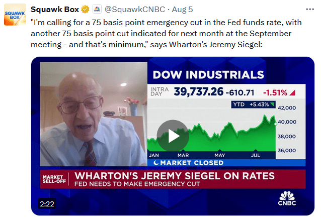 On Monday morning, famed economist and Wharton professor Jeremy Siegel called for an emergency 75bps rate cut and another 75bps cut at the September meeting. His statement is irrational and would have worsened the market problems. Let us explain.