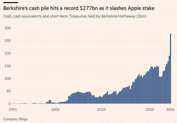Last weekend, it was disclosed that Buffett’s Berkshire Hathaway sold half its stake in Apple. Some in the media presume he sold a hefty chunk of Apple because he fears a steep market decline. Berkshire now holds $277 billion in cash, which is a record high. However, the amount of cash as a ratio of its market cap is slightly above the long-term average of 25%. Simply, cash is growing with the value of the portfolio.