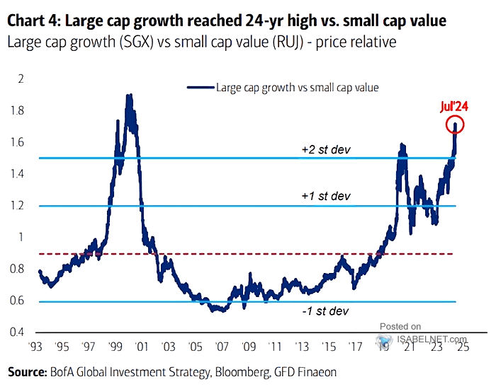 The BofA graph below, courtesy of ISABELNET.com, shows the price ratio of large-cap growth versus small-cap value stocks. Excluding the sharp drawdown in the ratio in 2020, large-cap growth stocks have consistently outperformed small-cap value stocks since the end of the financial crisis. Generally, large-cap and growth stocks outperform during periods of economic growth. Conversely, small-cap and value stocks outperform during recessions. Not surprisingly, valuations tend to expand during economic growth and contract during recessions. Therefore, much attribution for the recent gross outperformance of large-cap growth versus small-cap value can be attributed to the type of stocks the two indexes hold.