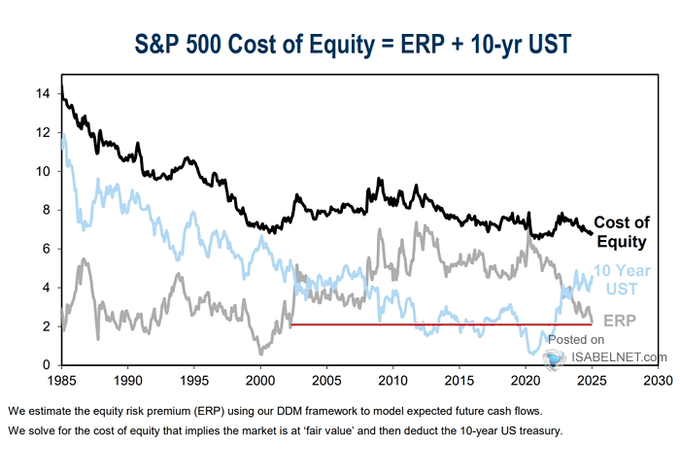 Secondly, valuations are becoming more of a concern for markets, particularly as the equity risk premium declines. Equity risk premiums (ERP) are also driven by sentiment. As investors expect increased asset prices, they are willing to be “paid less” for the “risk” they are taking to own equities. However, with bond yields now significantly above the ERP, there is an increasing probability that investors, at some point, may opt for being “paid” by owning bonds.