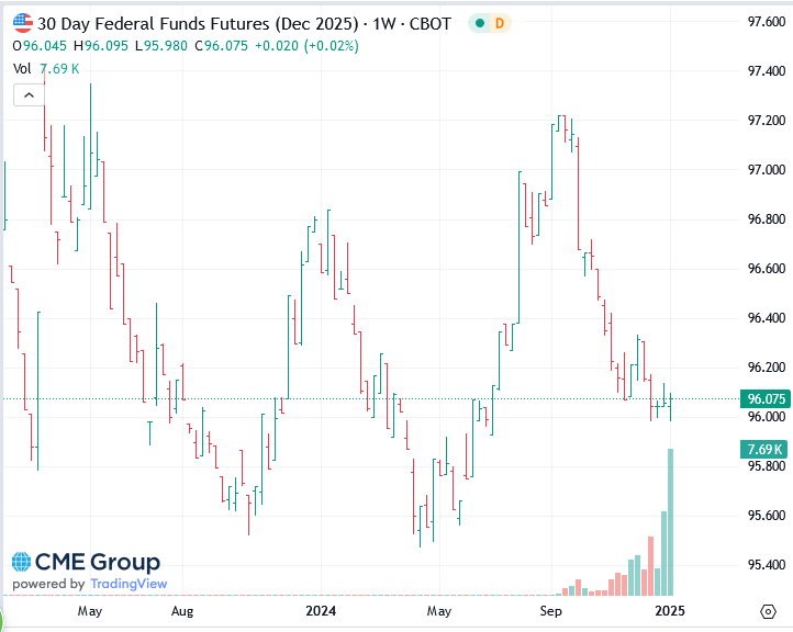 Market expectations for more rate cuts have diminished significantly, as witnessed by rising bond yields. The graph below, courtesy of the CME, shows that the market implies a 50/50 chance the Fed will cut by 25bps or 50bps during the remainder of the year. It assigns a 15% they don’t cut and about 20% they cut by more than 50bps. As a reference, in September, when the Fed initially cut rates by 50 bps, the market thought Fed Funds would end 2025 at 2.80% (100-97.20), as shown in the second graph.