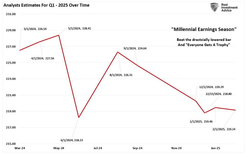 As shown, the earnings estimates for Q1, which companies will start reporting in April, have declined from $226/share in March of last year to just $219. We may see further revisions to reduce earnings with only two weeks before earnings season begins. However, that reduction in the “E” is part of the market’s recent reversion process.