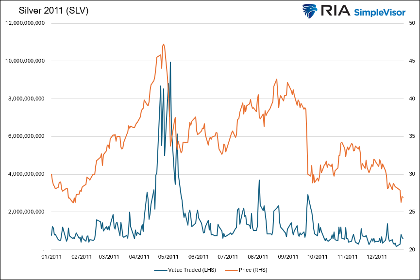 While the recent drawdown in silver was not easy predict, there was one omen that it was overdue for a sharp reversal. This warning sign was surging ETF volume. ETFs are predominantly traded by retail investors, who tend to chase trends in their latter innings.