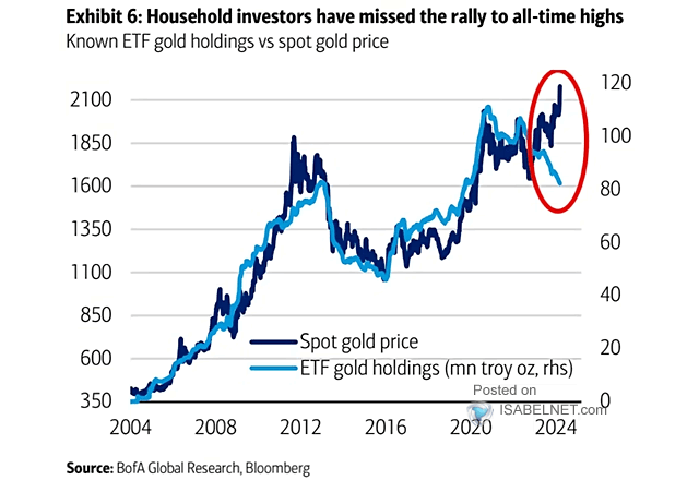 The graph below serves as another warning that something is awry. It shows how the inflows and outflows of gold ETFs tend to track the price of gold closely. However, recently, the two have sharply diverged. One rationale is that retail is not participating in the rally. Another states that institutions or central banks are buying gold via the gold ETFs. They convert ETF shares into physical gold via the ETF managers. It could also be an arbitrage opportunity or something else entirely. However, what matters most to gold investors is how might the “alligator jaws” resolve themselves.