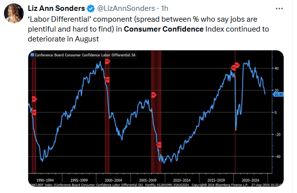 Recent surveys of labor sentiment point to potential problems. For instance, last week, we shared the New York Fed consumer expectations survey, which showed that more people fear being unemployed in the next four months than at any time since 2014. Furthermore, the University of Michigan survey section regarding expected changes in household income is nose-diving. Yesterday, the consumer confidence survey by the Conference Board showed an improvement in overall sentiment, but its labor differential gauge continues to deteriorate. As shown in the Tweet of the Day section below, downward trends in this indicator have been associated with recessions.